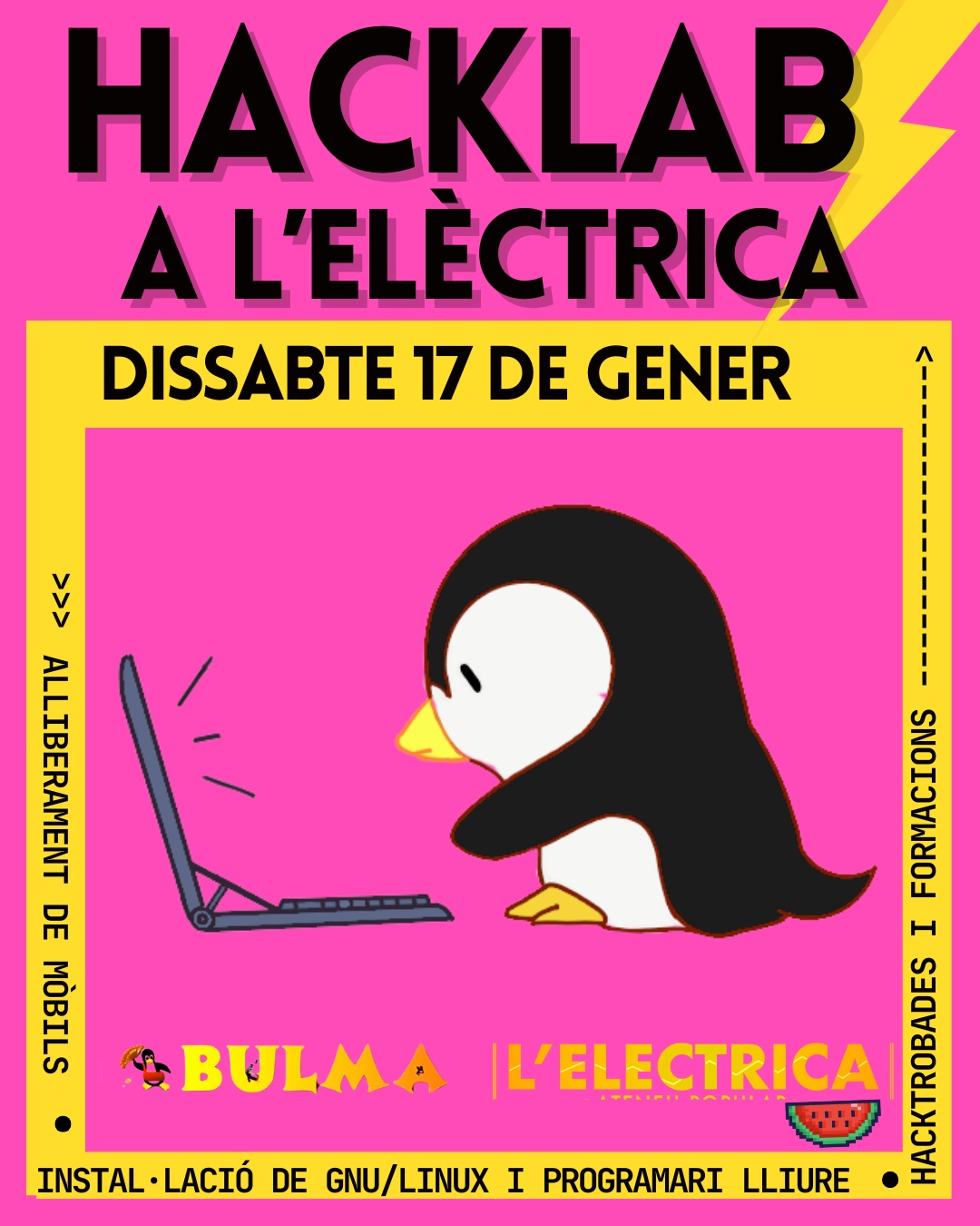 Cada primer i tercer dissabte del mes a les 10h ens trobam amb BULMA al Hacklab en l’Ateneu Popular L’Elèctrica per conspirar, desobeir i reapropiar-nos de les eines digitals.