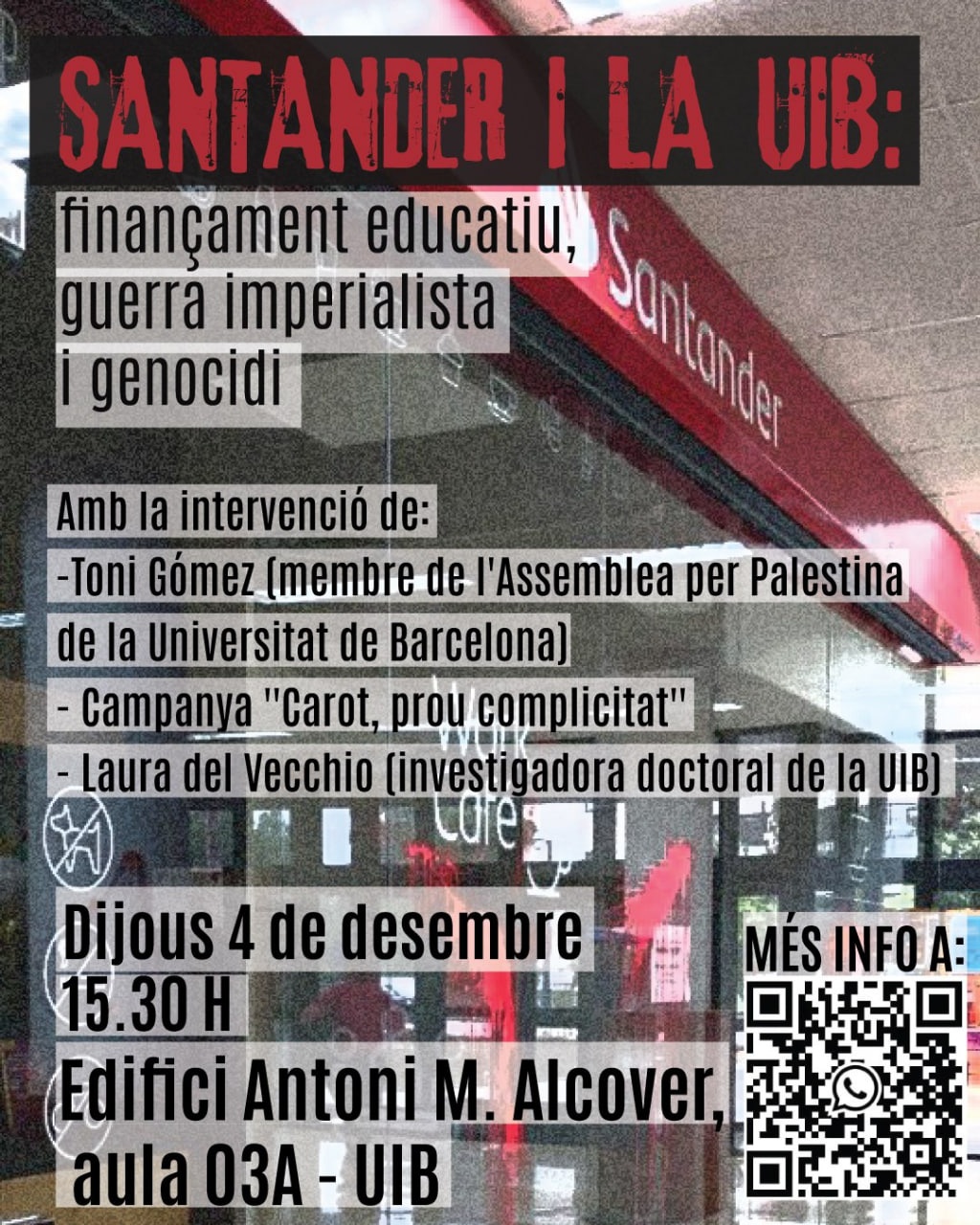 Des de la campanya "Carot, prou complicitat!" continuam denunciant els òrgans i empreses que donen suport al genocidi. Per això, el dijous 4 de desembre organitzam un acte centrat en el paper de Santander a l'educació universitària i en la seva presència a la UIB on intervendran Toni Gómez, membre de l'assemblea per Palestina a la Universitat de Barcelona; Laura del Vecchio, investigadora a la UIB i membre de la revista Nosaltres; i membres de la campanya "Carot, prou complicitat!".